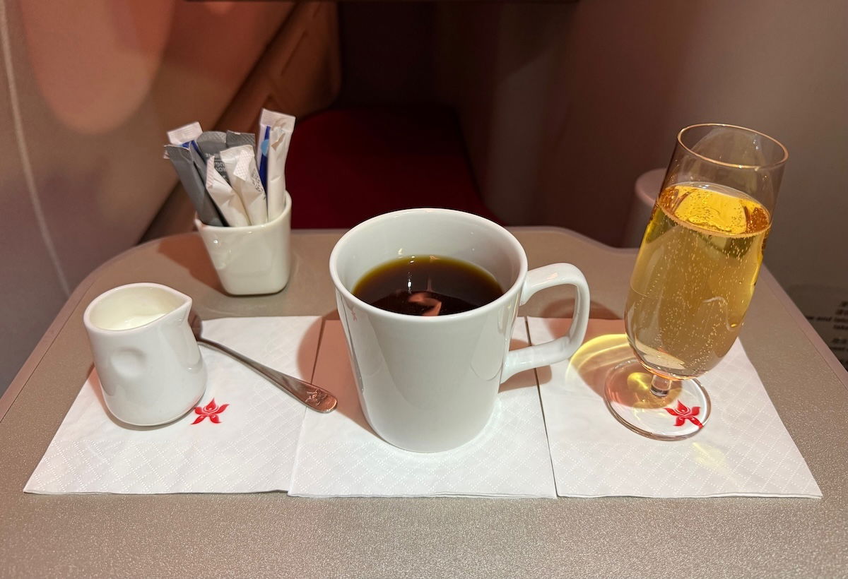 While there were no espresso-based drinks, the filtered coffee was decent, and tasted even better after a glass of champagne (the airline pours Charles de Cazanove Brut Champagne). 😉