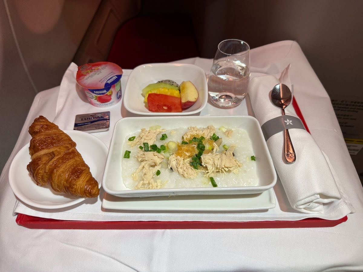 There were three breakfast options, and I chose the Chinese meal, which consisted of congee with shredded chicken, dried scallop, and mushroom, served with fruit, yogurt, and a selection from the bread basket.