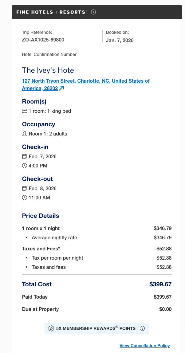 I live just 90 minutes from Charlotte, and my partner and I frequently visit to enjoy the city. I’d noticed previously that Amex Fine Hotels + Resorts properties in Charlotte tend to be priced more modestly than in larger cities, where rates can easily top $1,000 per night. So, I decided to take a look at one-night stays in February.