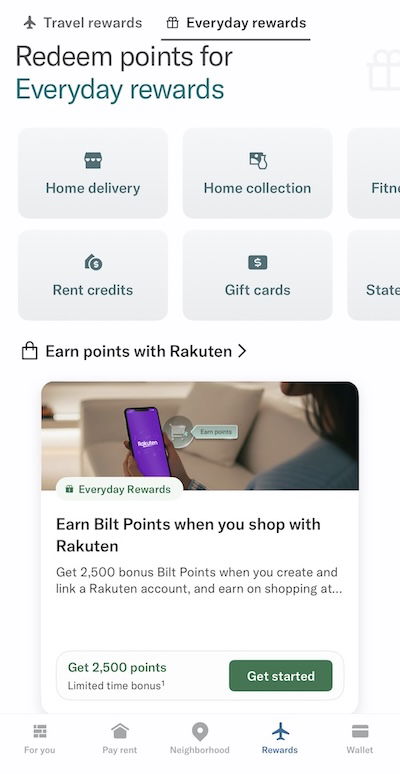 So once you have a Rakuten account, you’ll want to either visit the partnership page on Bilt’s website, or go to the Bilt app. Once in the Bilt app, navigate to the “Rewards” section, and then select the “Everyday rewards” section. There you’ll see the “Earn points with Rakuten” heading, so click on “Get started.”