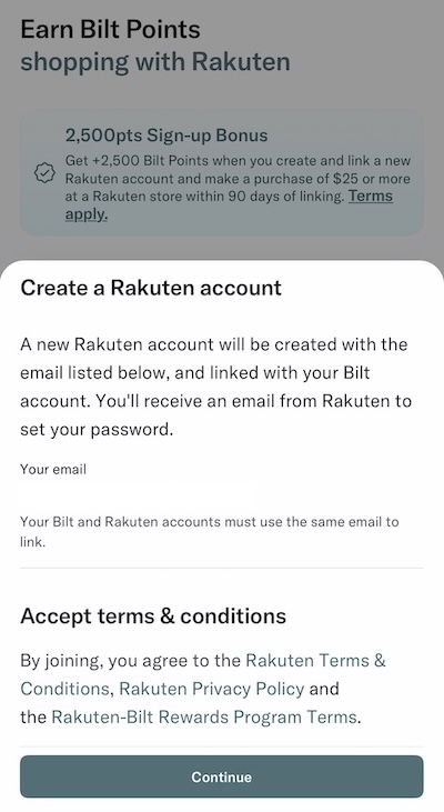 If you have an existing account (or even if you don’t), click on the “Create account & link” button. Make sure that the emails associated with your Bilt and Rakuten accounts match.