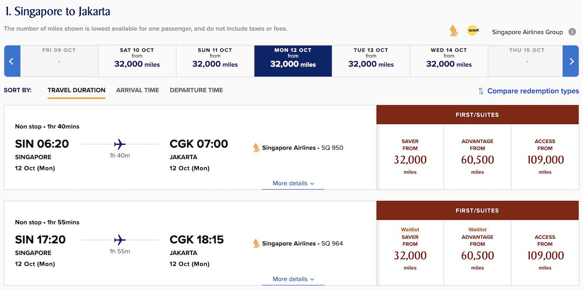 For example, from Singapore to Jakarta (Singapore Airlines’ shortest route with first class), I see plenty of Saver 777 first class award availability way in advance, so snagging that is no issue.