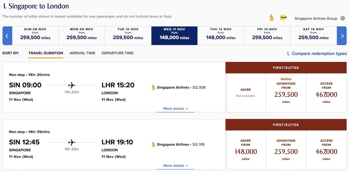 Meanwhile from Singapore to London, I see a Saver seat way in advance for 777 first class (the second flight below), while A380 Suites (the first flight below) can only be waitlisted at the Advantage level.