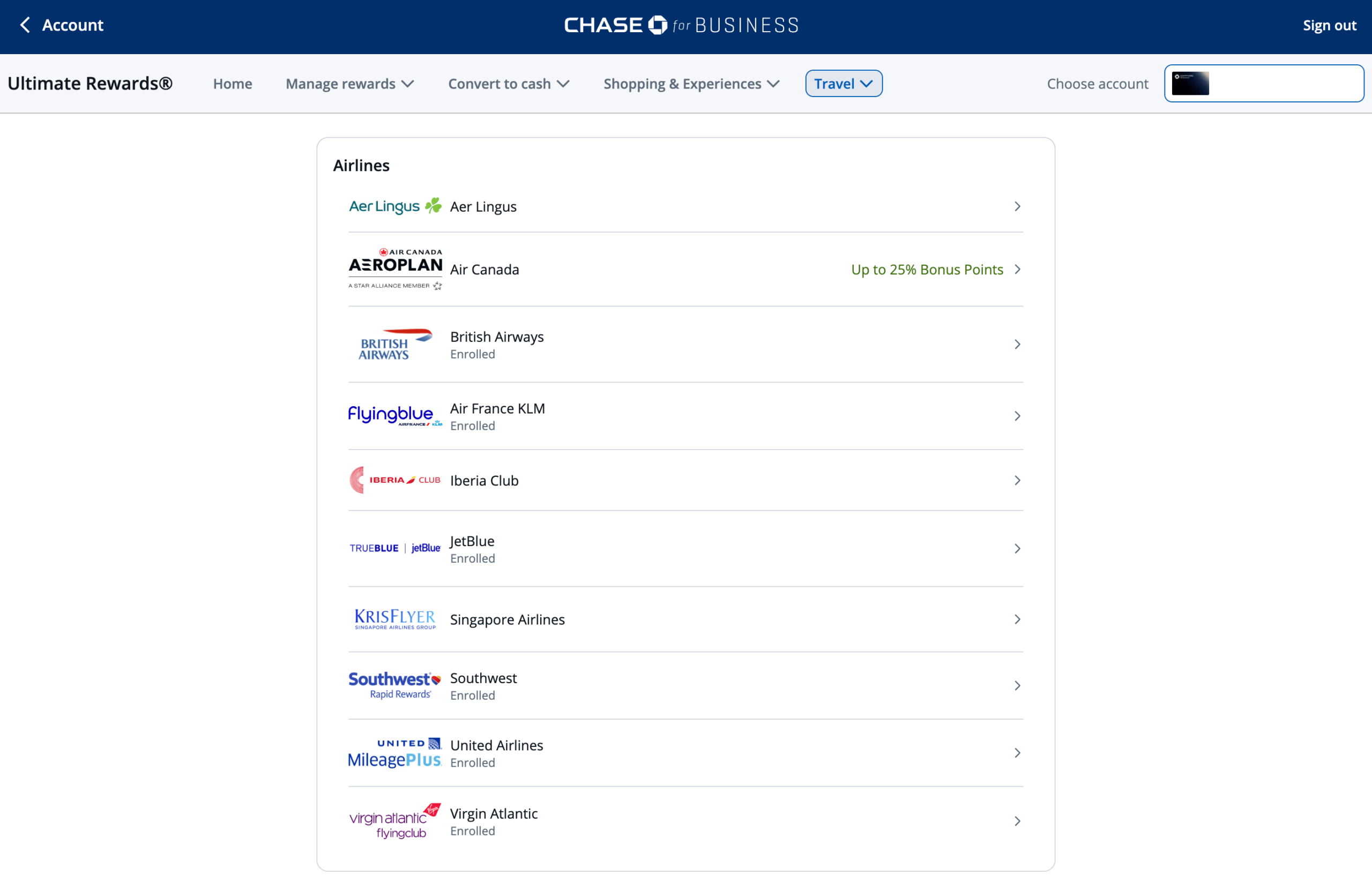 You will then be redirected to a page that displays all Chase transfer partners. Click on the Singapore Airlines KrisFlyer row.