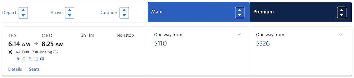 For a similar yet slightly different example, let’s take a Tampa to Chicago flight on American, where (non-basic) economy costs $150, and first class costs $326.