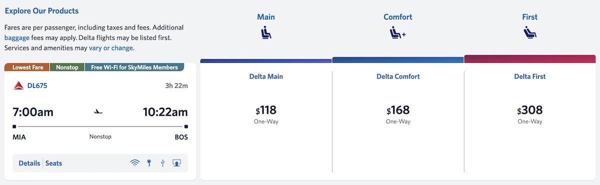 I don’t have status with Delta, so if I want to fly first class, I have to pay. Take a Miami to Boston flight on Delta for example, where non-basic economy class costs $158 (the $118 price is for basic economy), and first class costs $308.