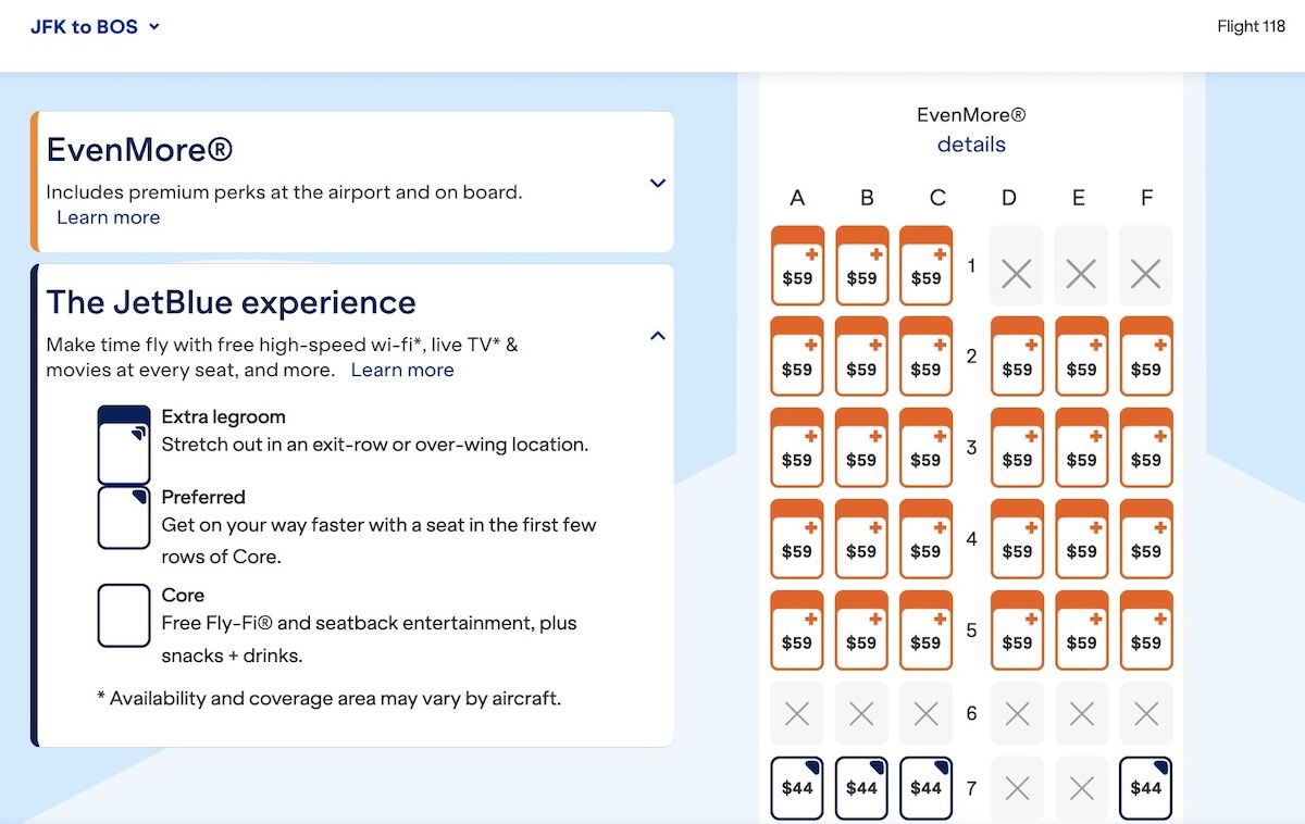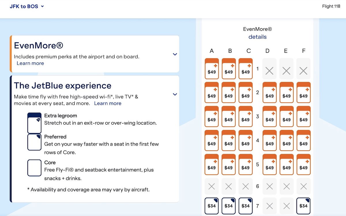 The catch is that assigning an EvenMore seat is more expensive on a basic economy fare than a regular economy fare. The difference isn’t necessarily huge, but it is noticeable. For example, let’s look at the same JetBlue flight from New York to Boston. Below is the seat map when booking a Blue fare (non-basic economy).