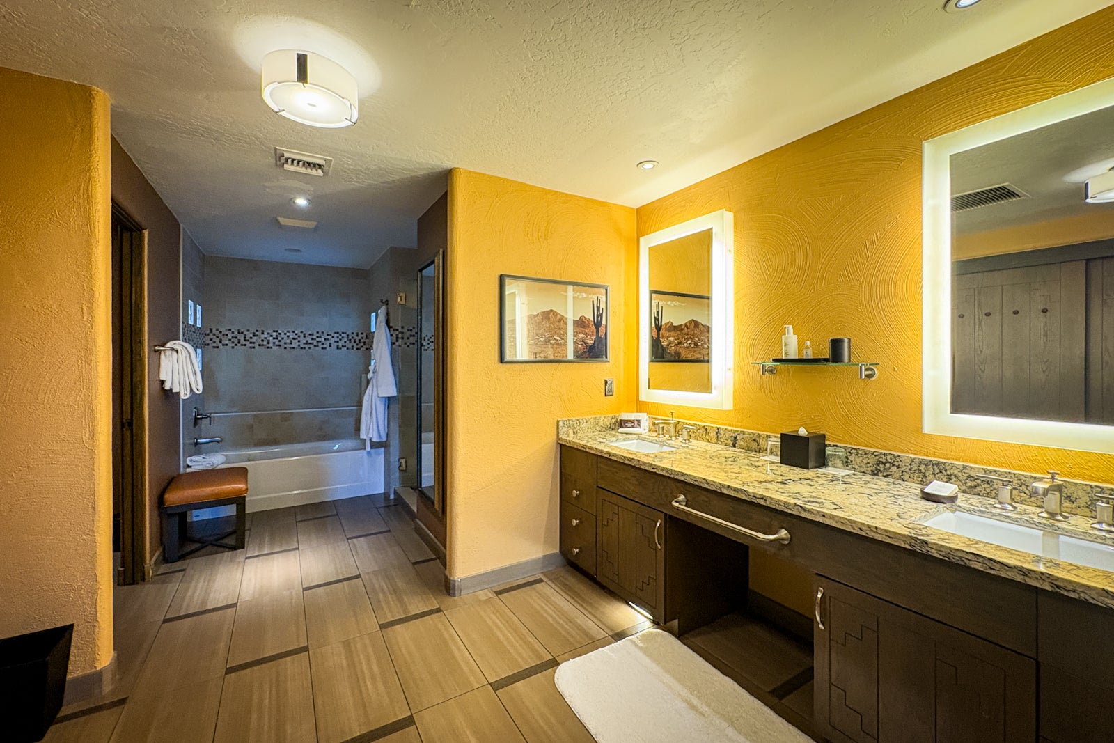 The huge bathroom — separated from the bedroom by double sliding doors — included a tub, separate shower, double vanity and full closet. Bath amenities pay homage to the calming scents of the desert, courtesy of Aromatherapy Associates London.