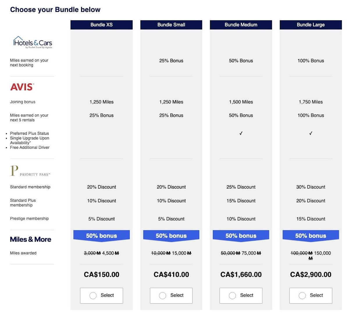 As you’ll see, these bundles come with extra perks, including bonus miles when you book through the Hotels&Cars platform, bonus miles with Avis, and Priority Pass discounts.