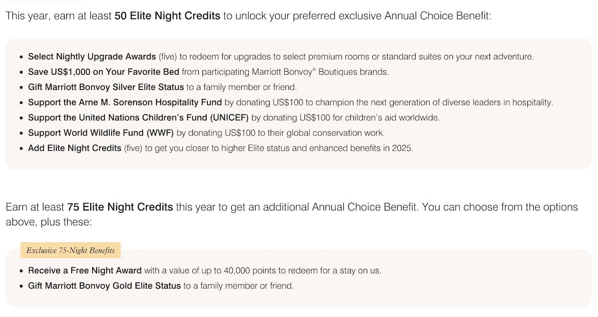 Then Marriott Bonvoy members who pass 75 elite qualifying nights in a year can choose from the following rewards (as you can see, this offers two elevated choices):