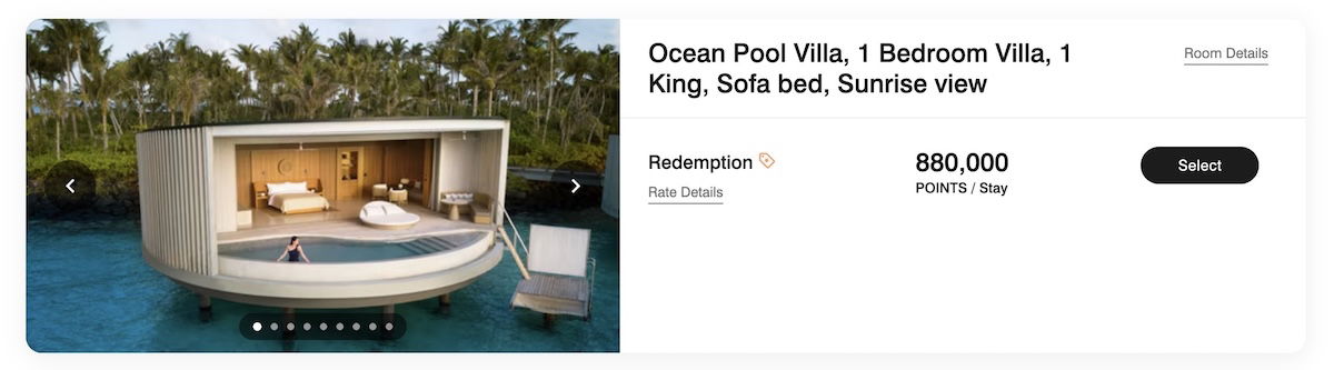 Another aspirational destination is the Maldives, so let’s also use the Ritz-Carlton Maldives as an example. During the busiest time of year (near festive) I can find a five night award stay for 880,000 Bonvoy points (including one free night), which comes out to an average of 176,000 Bonvoy points per night (which I value at ~$1,232).