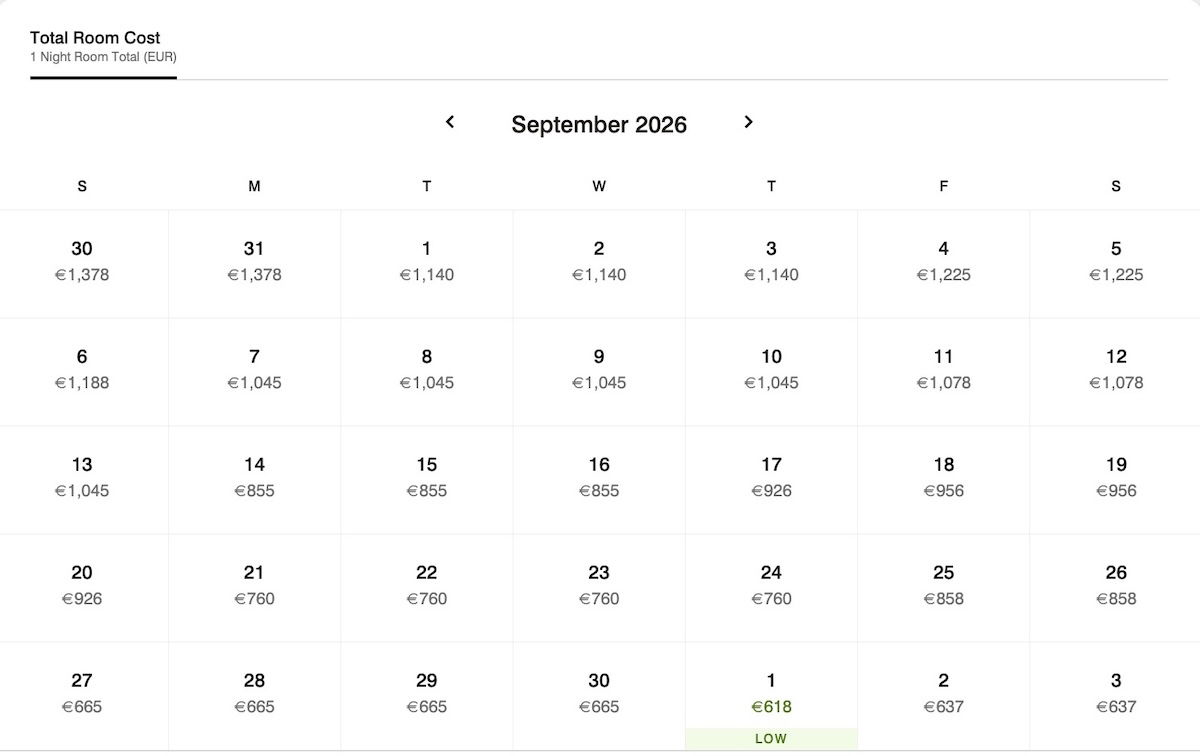 For example, in the case of the hotel I was searching, it’s interesting how on August 30, the rate is either 1,378 EUR or 131,500 Bonvoy points, while on October 1, the rate is either 618 EUR or 125,500 Bonvoy points. Obviously the former is a much better value redemption than the latter.