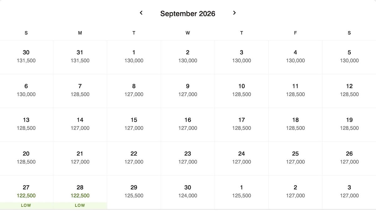 You can then also switch between the award calendar and the pricing calendar, to see when you’re going to get the best value.