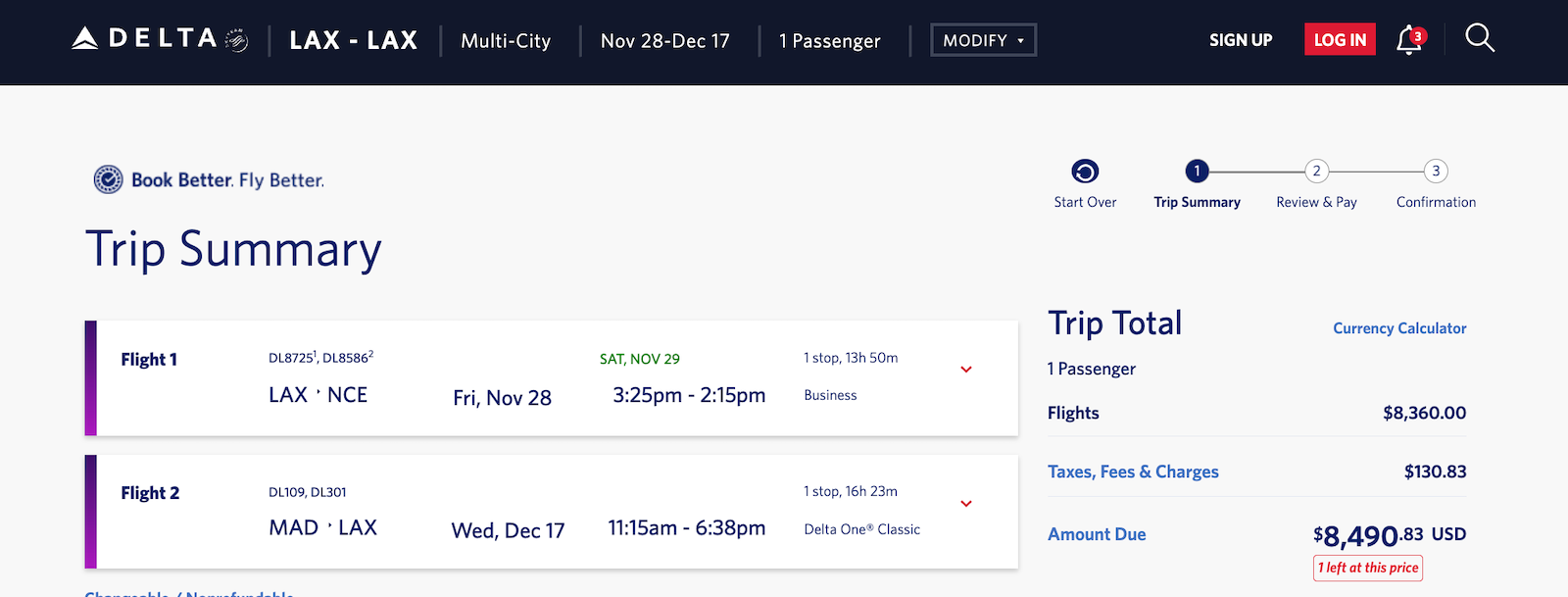 In my case, I was searching for an open-jaw business-class ticket going from Los Angeles to Nice, France, and then from Madrid to Los Angeles at the start of December.