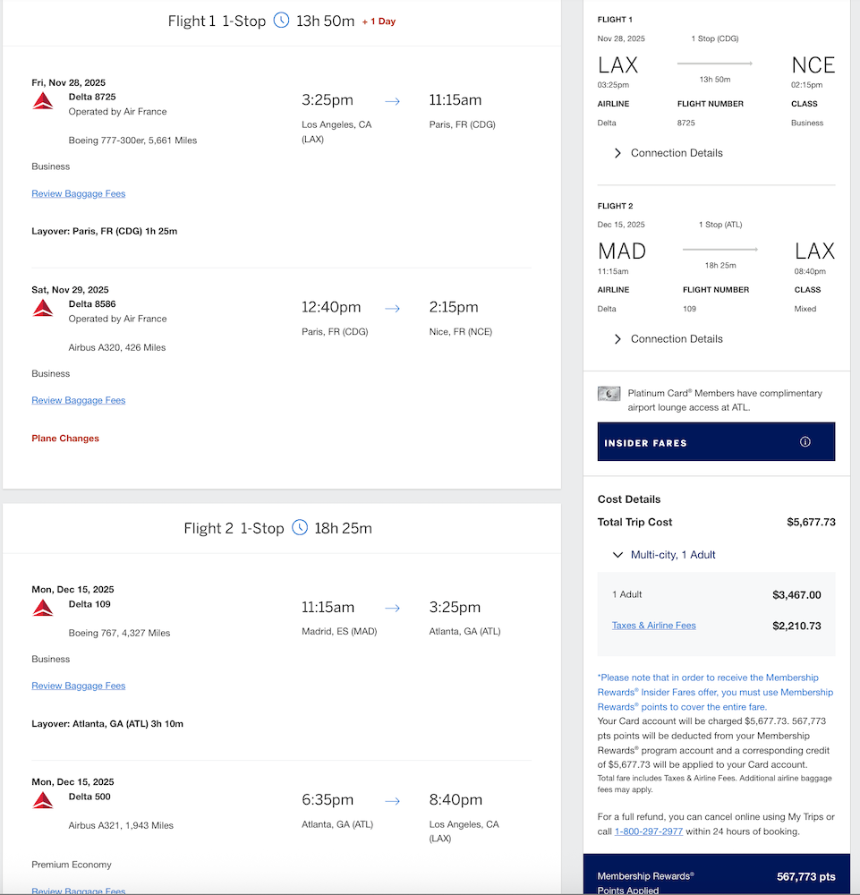 Then, I decided to log into my Business Platinum account on Amex and search for fares. I came across a great itinerary that would have me flying from Los Angeles to Nice via Paris and back from Madrid via Atlanta.