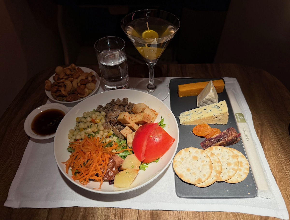 As is standard, Emirates has a flexible “light bites” menu after takeoff, where you can choose from several options (most people just elect to go straight to sleep). I decided to order a tofu poke bowl and a cheese plate, both of which were very good. Then to drink I had a martini — you’ve gotta love how Emirates serves them in proper martini glasses!