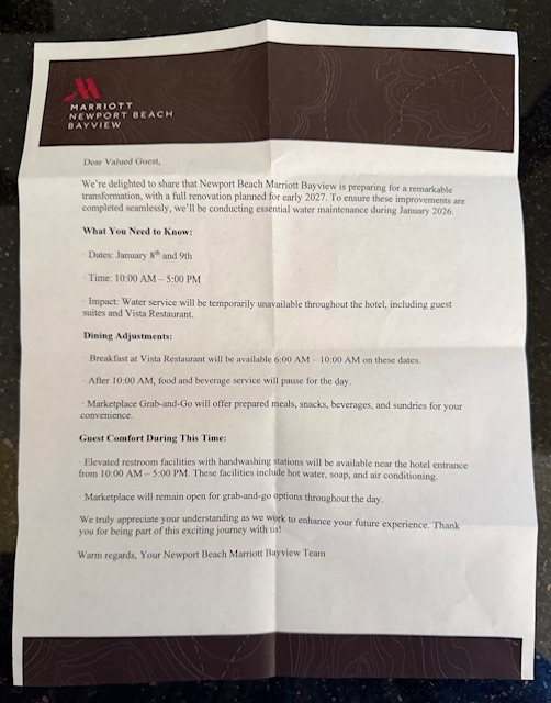 They provided a letter to guests. Showers weren’t working. A reader shares with me that they did not contact guests in advance of their arrival, and when they pushed they were offered 10,000 Marriott points as compensation (worth ~ $60).