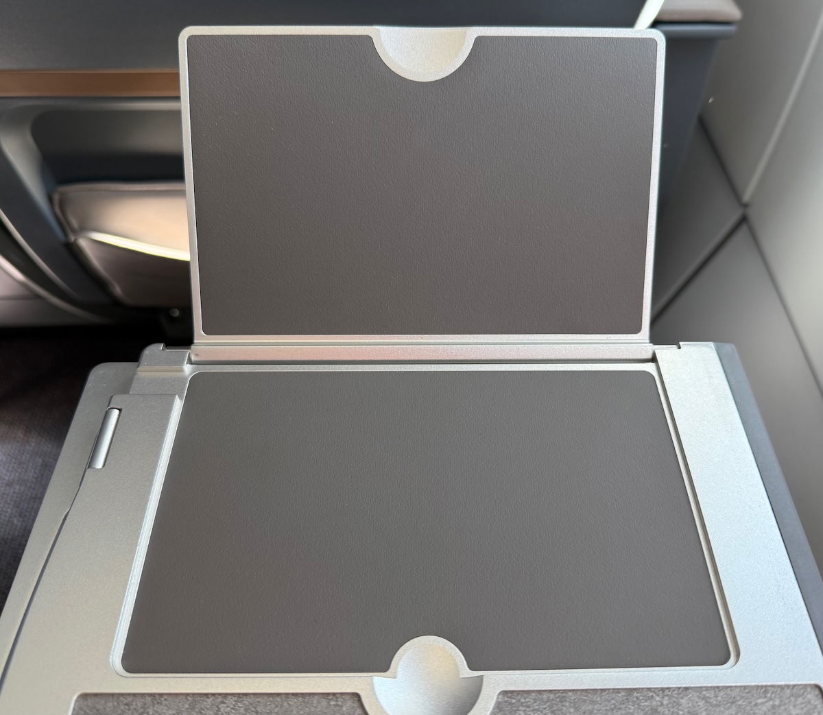 The tray tables extend from the far armrest, and can be folded over in half. When folded over, the tray table has a little personal device holder, for watching your own entertainment.