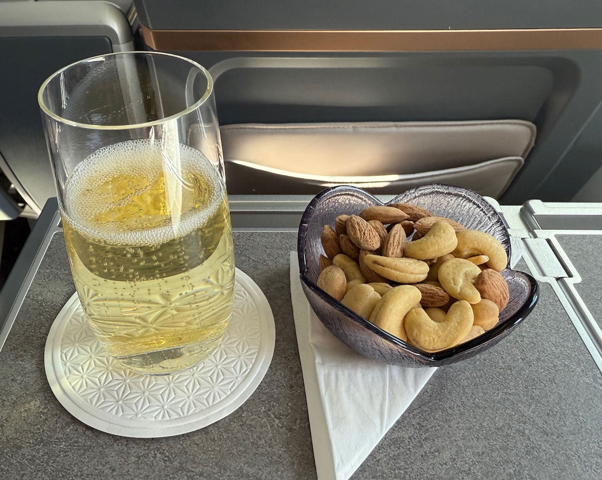 The first round of drinks was served around 30 minutes after takeoff. I decided to order a glass of champagne, as I was happy to see that Laurent-Perrier is served on this sector, just as it is on long haul flights. That was served with mixed nuts, in a beautiful ramekin.