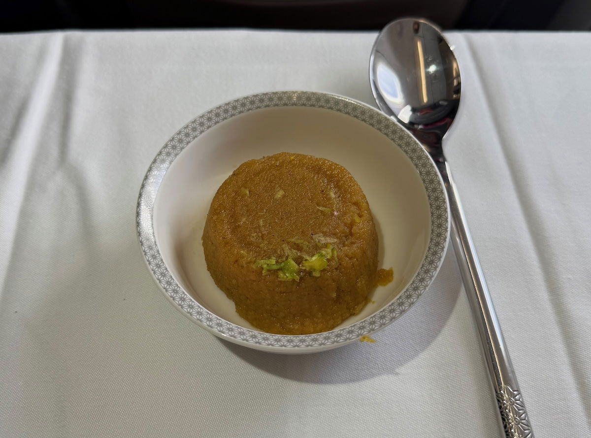 It’s impressive that Air India has four main course choices, and I selected the awadhi paneer anjeer pasanda, described as fig layered cottage cheese with creamy tomato ginger fenugreek gravy, cumin, basmati pilaf, and vegetables. A bread selection was also offered, including garlic bread and poppadum.