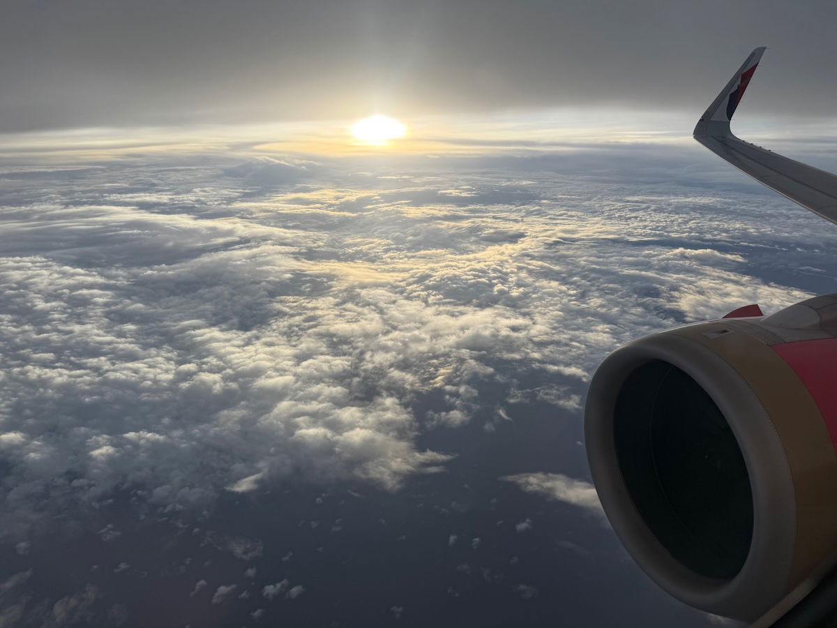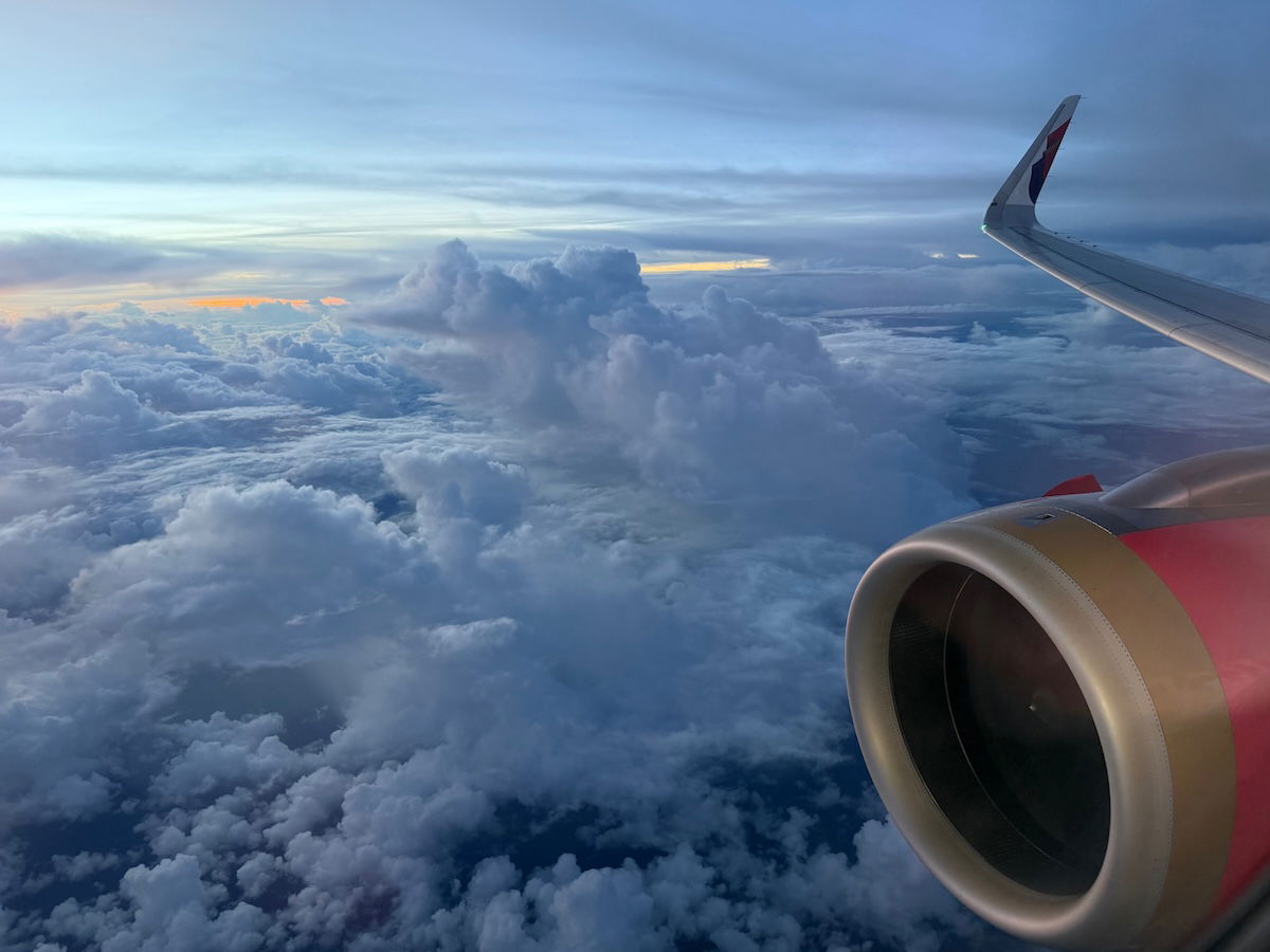 As we cruised toward Malaysia, I enjoyed the views out the window. While there wasn’t necessarily that much to see, the clouds were beautiful, especially with the sun setting. Around an hour out, we hit quite a bit of turbulence, causing service to be suspended.