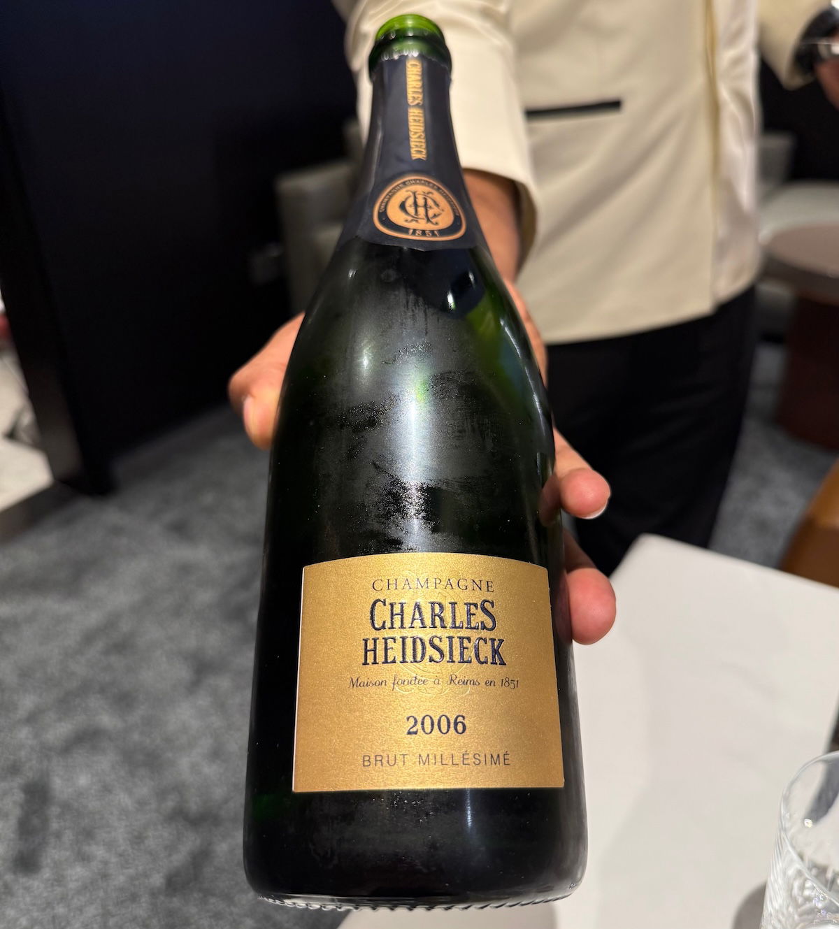 A glass of champagne was immediately poured — 2006 Charles Heidsieck Brut Millesime was on offer, which I believe is slightly better than their standard champagne in the lounge.
