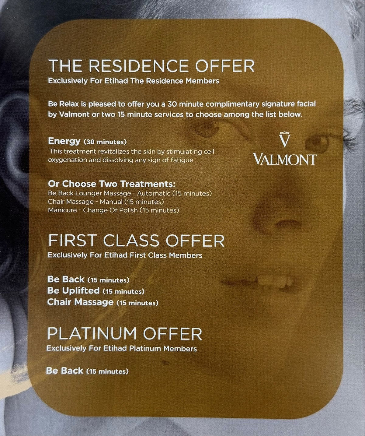 - Etihad The Residence passengers receive a complimentary 30-minute signature facial, or two 15-minute services, with options like a chair massage and manicure