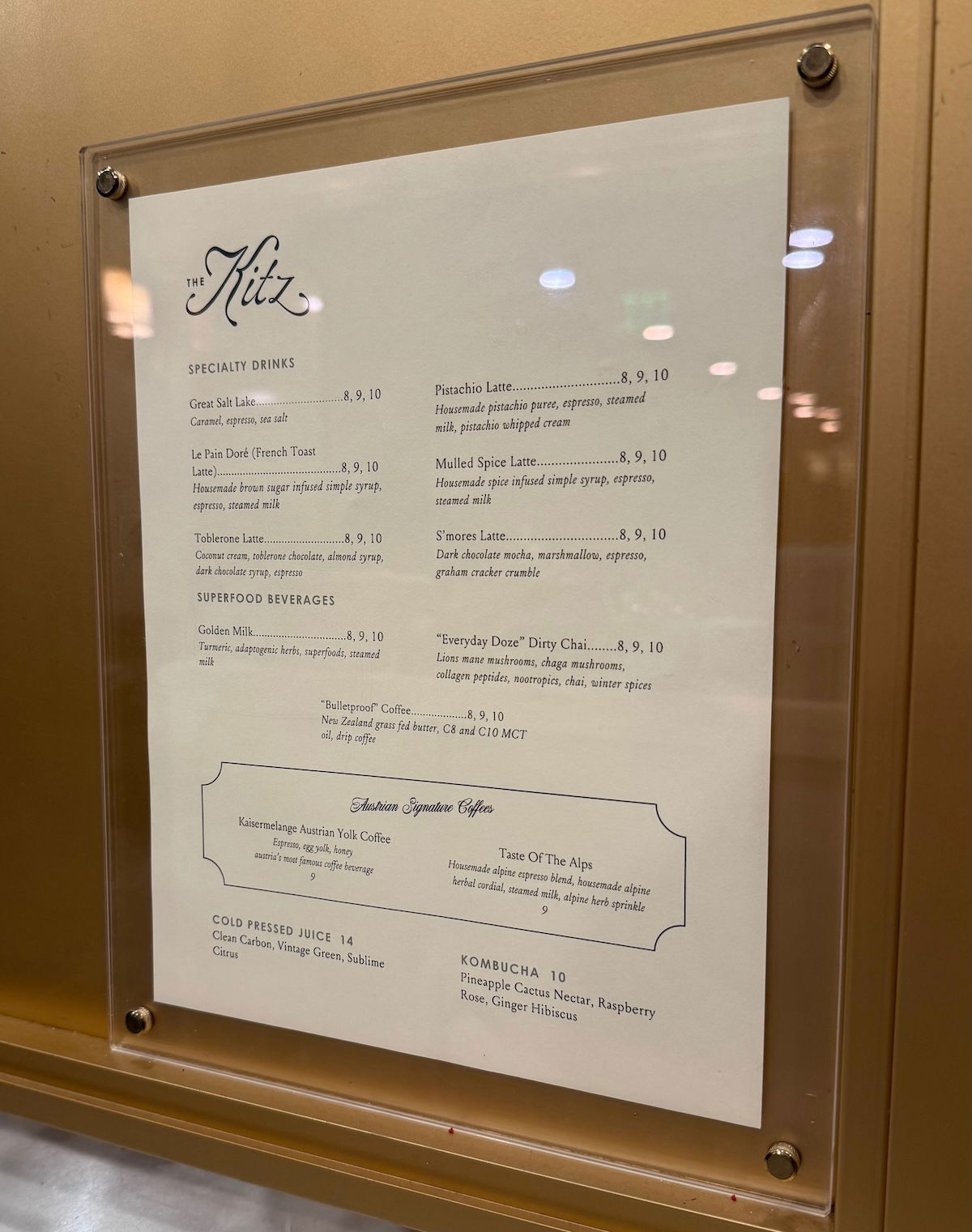 The Kitz is the hotel’s coffee shop, which is open daily from 6:30AM until 4PM. It serves breakfast until 11AM, and then switches over to lunch. On the most basic level, this is a casual shop with barista coffee, pastries, and more. However, there’s also a more substantial food selection, with heartier dishes.