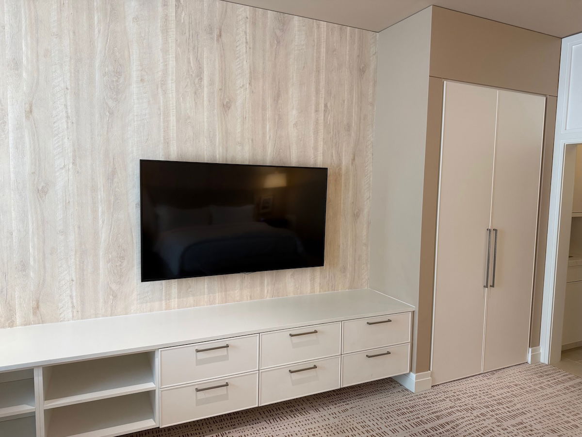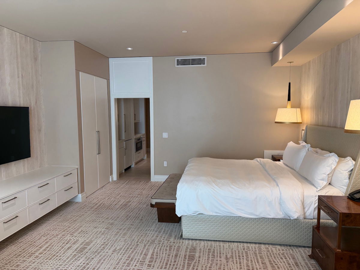 The room boasted a really comfortable king size bed, with a plush mattress and large pillows. The room then had a wall-mounted TV with a bunch of closet space across from the bed, plus an L-shaped couch and a desk with two chairs at the far end of the room.