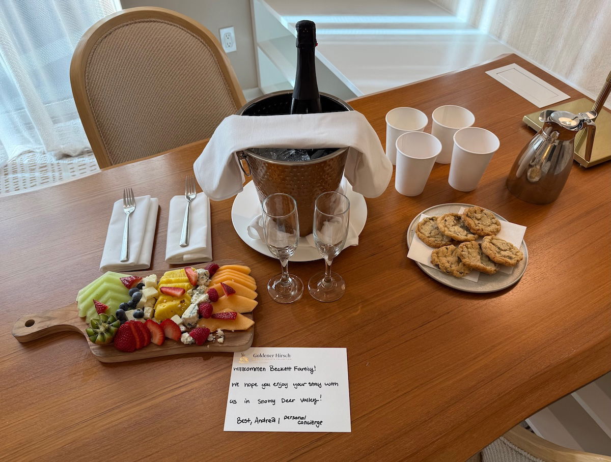 Waiting on the table was a lovely welcome amenity, with something for both kids and adults. Miles loved the freshly baked cookies and hot chocolate, we all appreciated the fruit and cheese plate, and Ford and I liked the bottle of Austrian sparkling wine. I really love how the property embraces its Austrian roots.