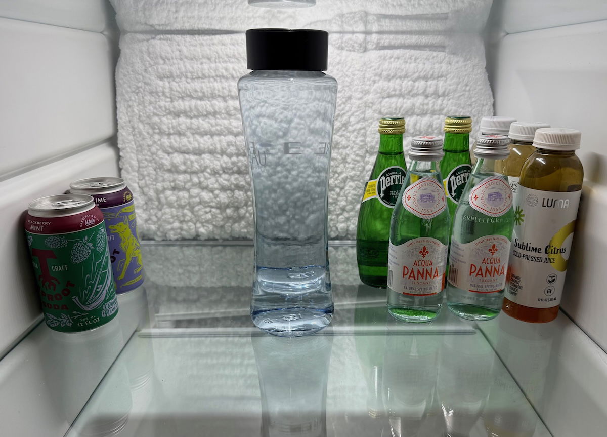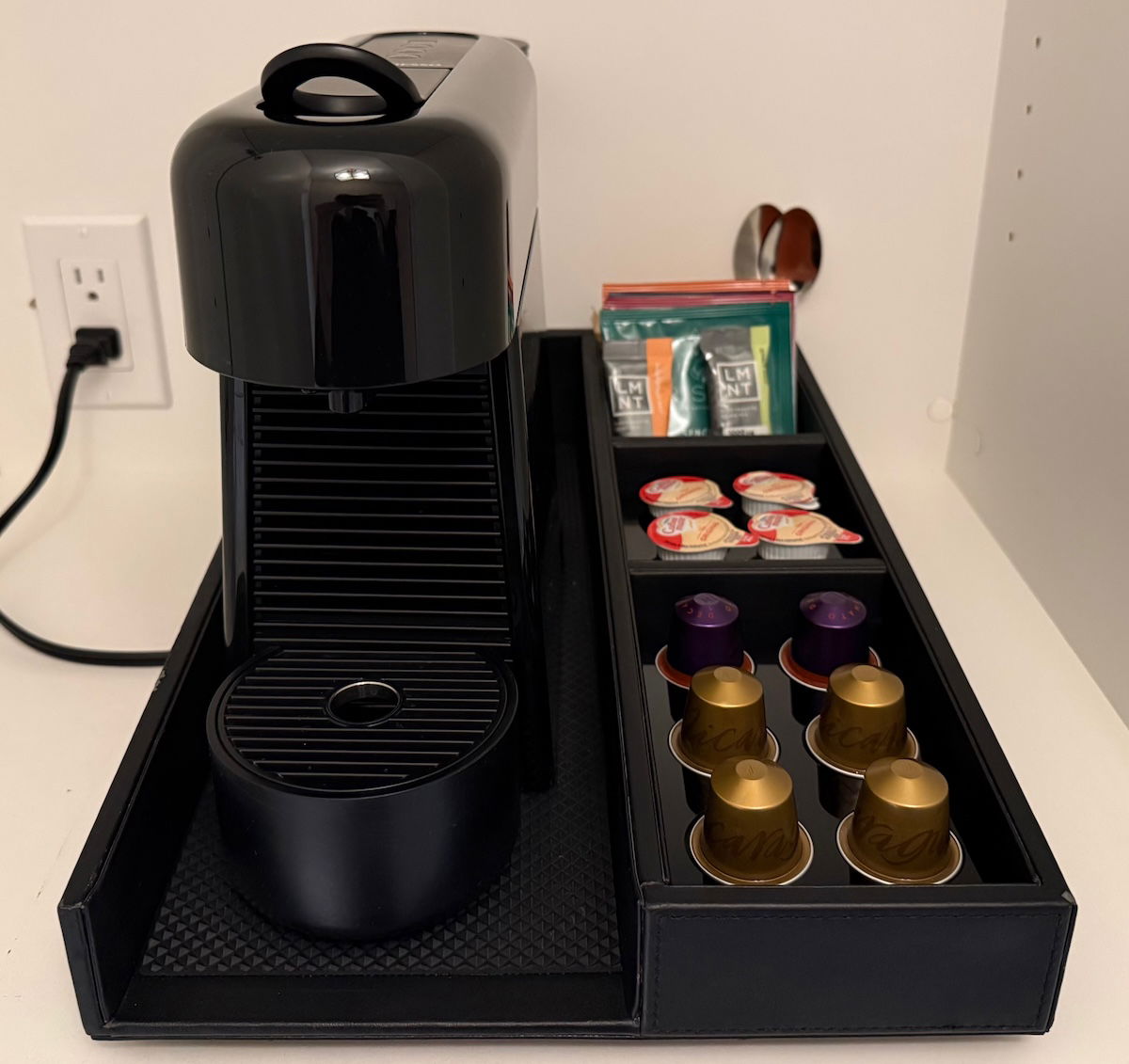 Back toward the entrance was the minibar, with a Nespresso coffee machine, along with a small selection of drinks and snacks for purchase.