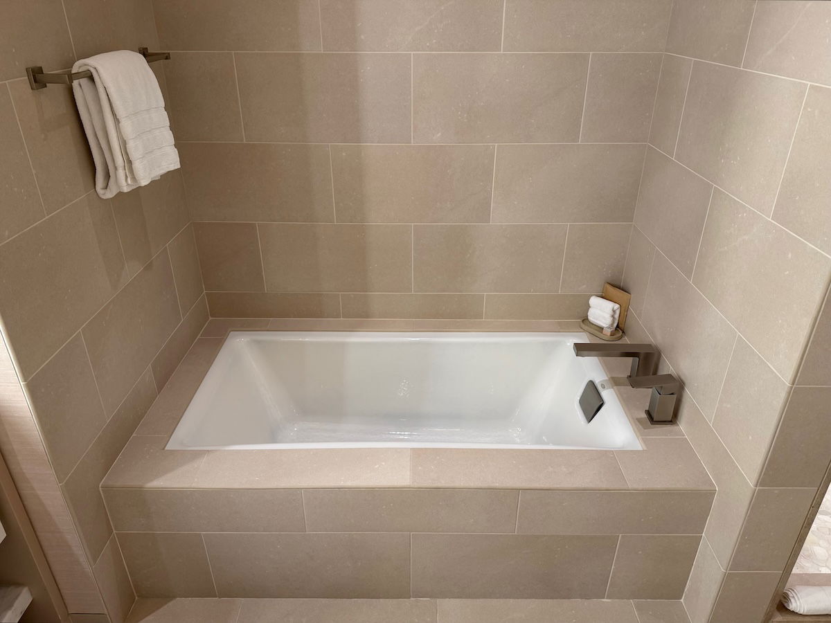 The bathroom was back toward the entrance, and was a great size, with double sinks, a soaking tub, a walk-in shower, and a toilet in a separate room.