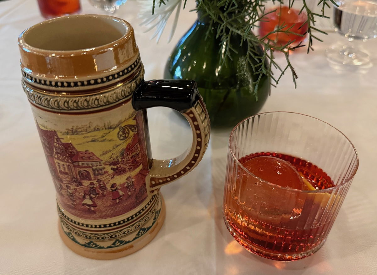 While we never had lunch or dinner at the hotel, we did come one afternoon with friends while the snack menu was available. I ordered a negroni, which was tasty (but small, per Utah laws), and I also couldn’t help but take a picture of our friend’s beer mug.