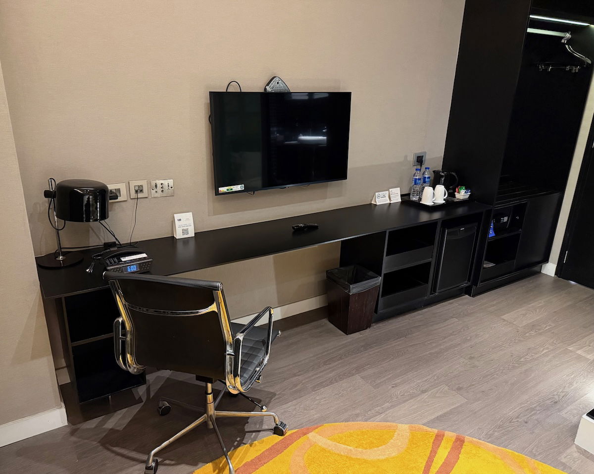 The room was pretty basic — it had a queen size bed, which was actually reasonably comfortable, with plush pillows. Across from that was a wall-mounted TV, and a desk with a rolling chair.