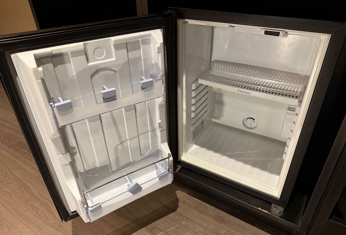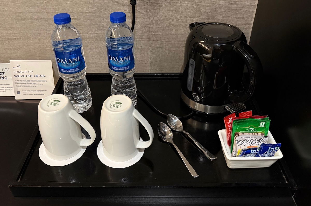 Also on the desk was two bottles of water, plus a kettle with some tea and instant coffee, all of which were complimentary. There was also an empty mini-fridge.