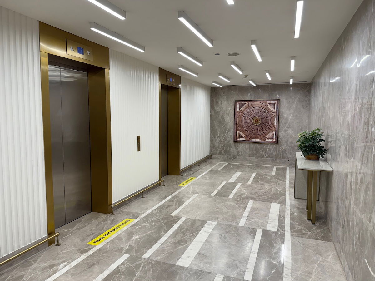 At the end of the hall you’ll see some elevators, so get into one of those.