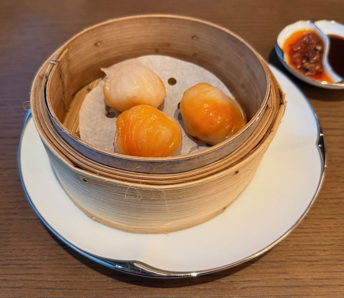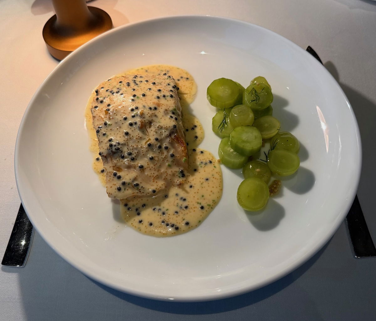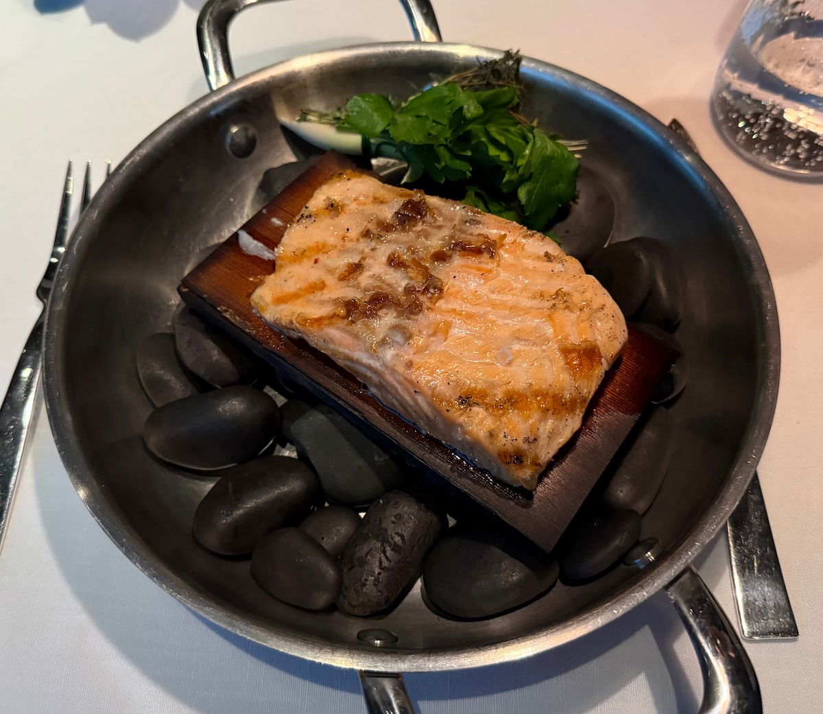 I decided to order the restaurant’s signature dish, the salmon on cedar wood, with cucumber, grape, caviar, and smoked butter sauce. At around $75, this is a mighty expensive piece of salmon, but I couldn’t help but give it a try, and I had a credit to spend, anyway.