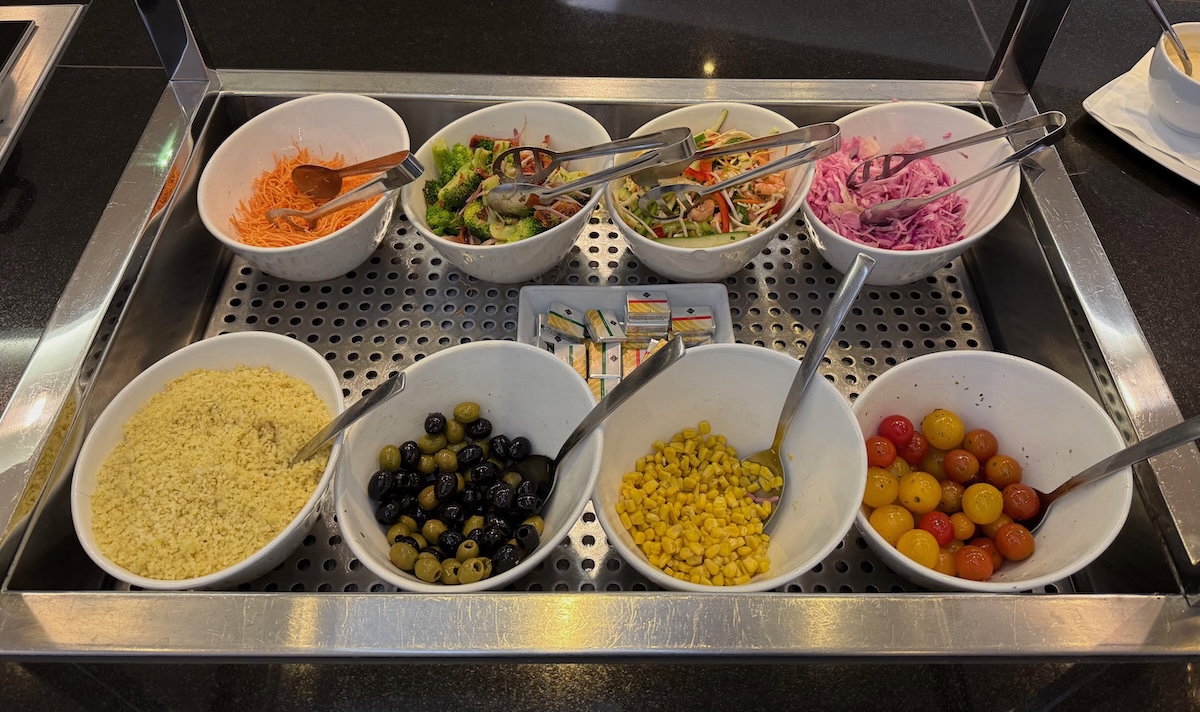 The food selection included a variety of salads and veggies, cold cuts, cheese, and hot options like basmati rice, lemon and thyme chicken, veal with mushrooms, and vegetables with spices.