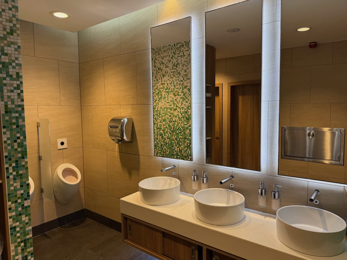 The men’s room had a few sinks, urinals, and toilets, and was relatively clean. The lounge also has showers (in theory), but it appears they might no longer be in use, since the Etihad days.