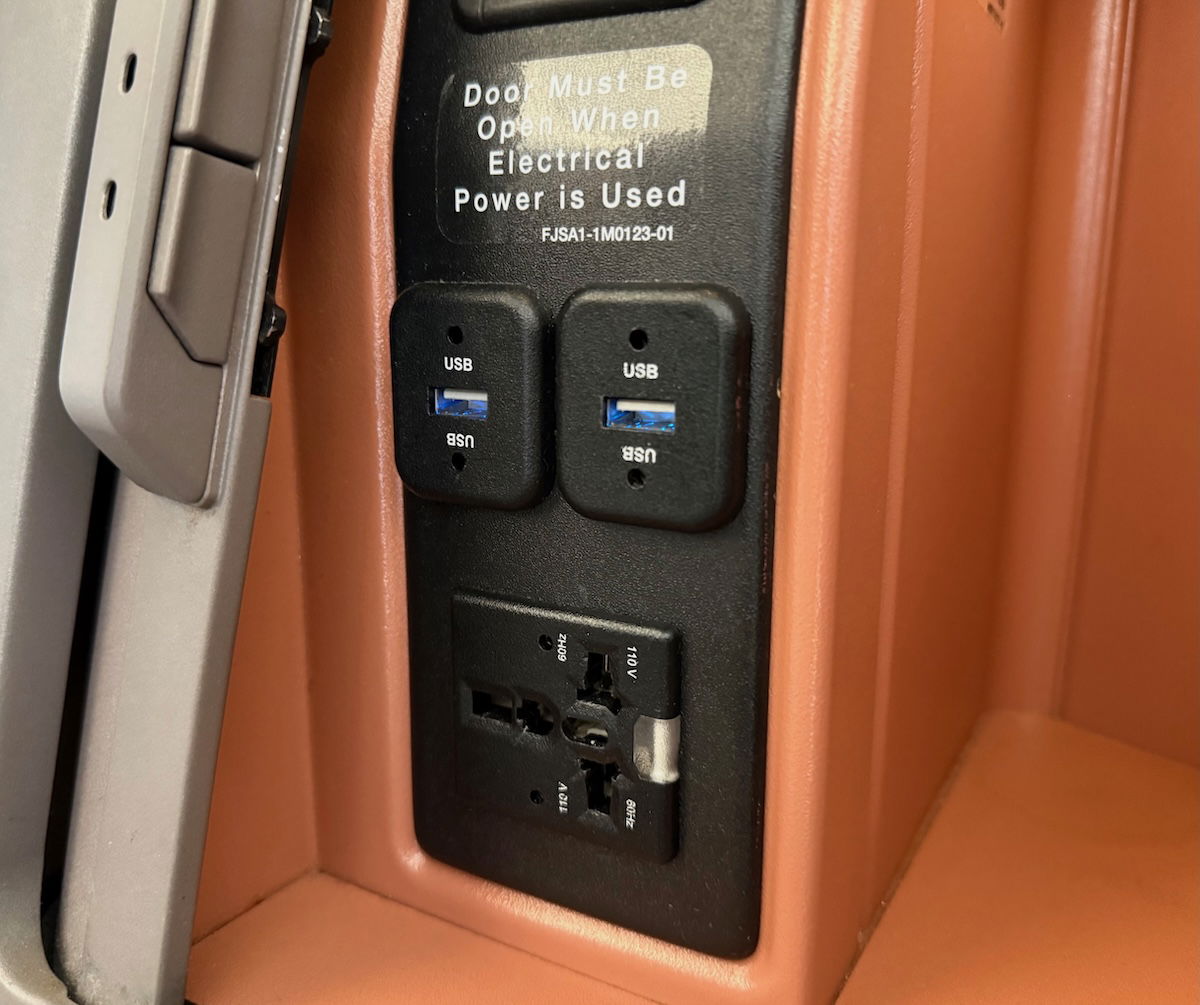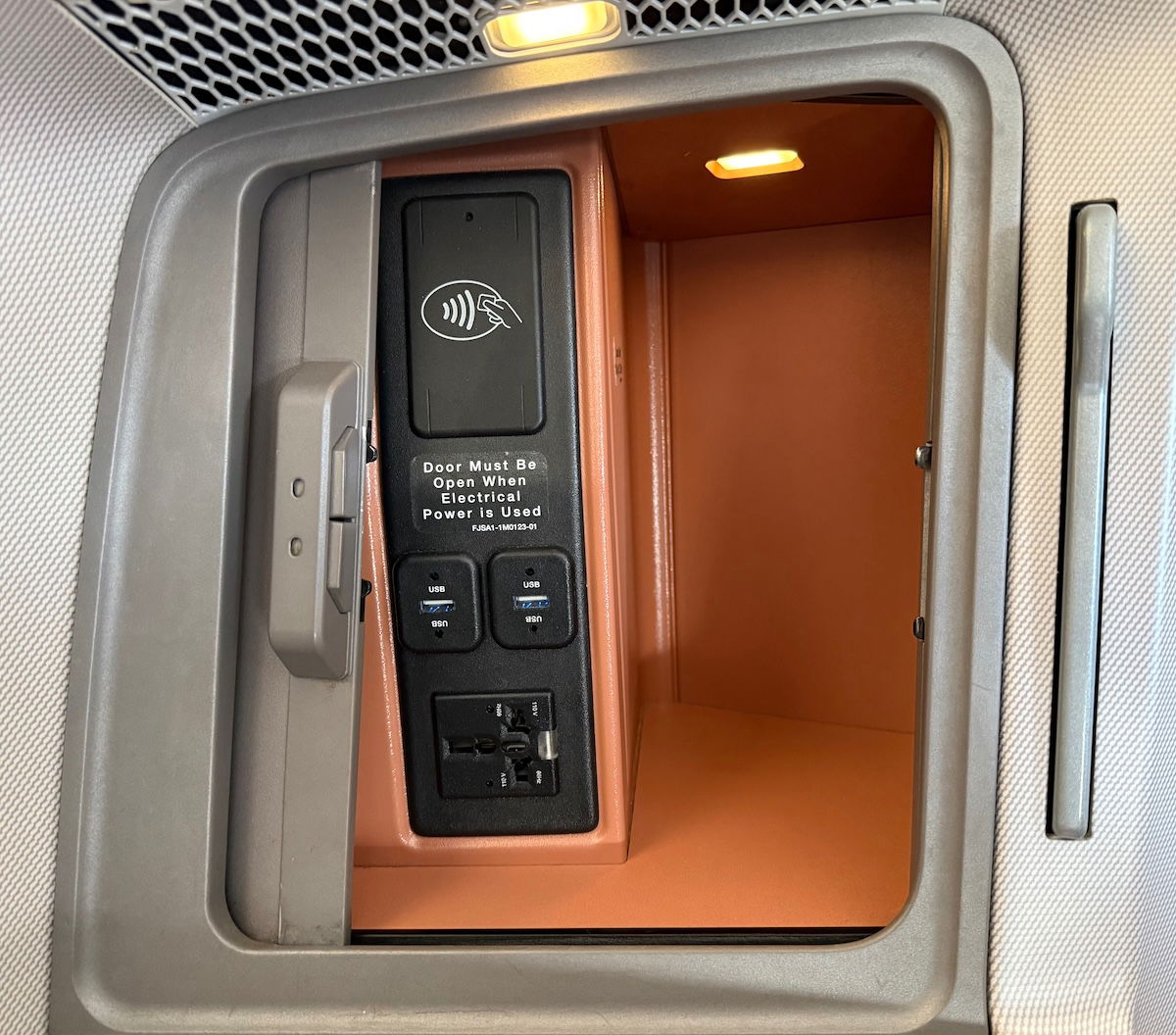 When it comes to the details of the seat, along the aisle-side is a large counter that’s big enough for placing a laptop during the flight. There’s also a large storage compartment, which can be fully closed. The compartment has enough space for lots of smaller items (headphones, phones, glasses, a wallet, etc.). It also has two USB-A outlets and an AC power outlet. Then there’s a small mirror that can be extended from the side of the seat.