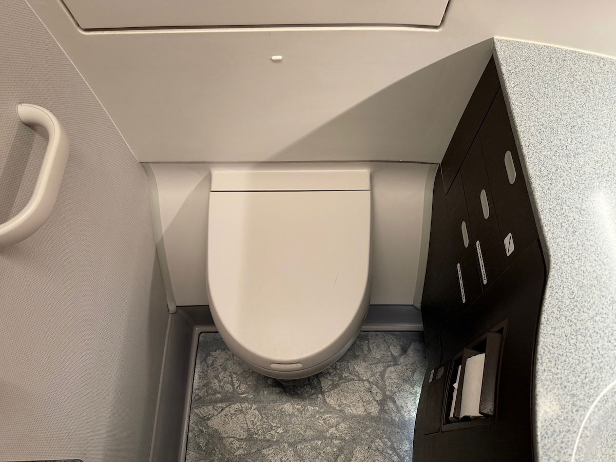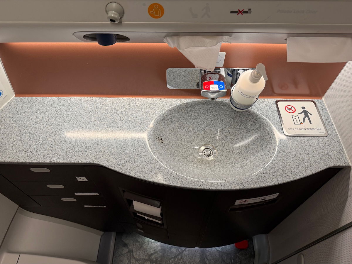 While the flight wasn’t very long, I also checked out the lavatories onboard. For business class passengers, there’s one lavatory at the front left of the cabin, and two lavatories in the center galley, between the two business class cabins.