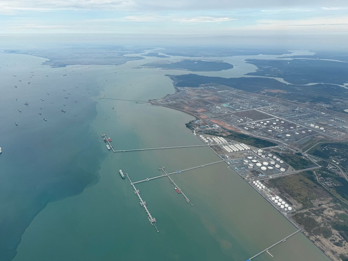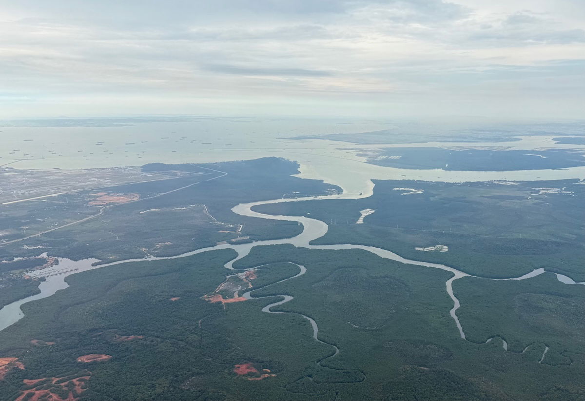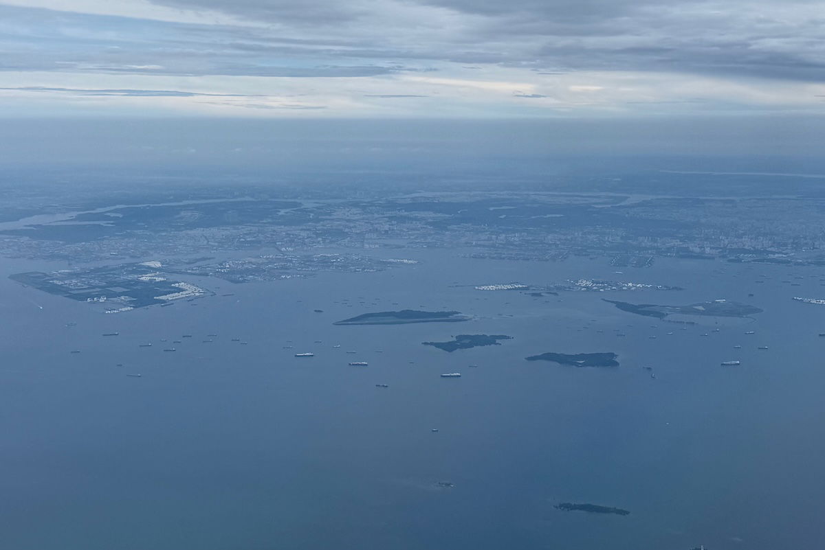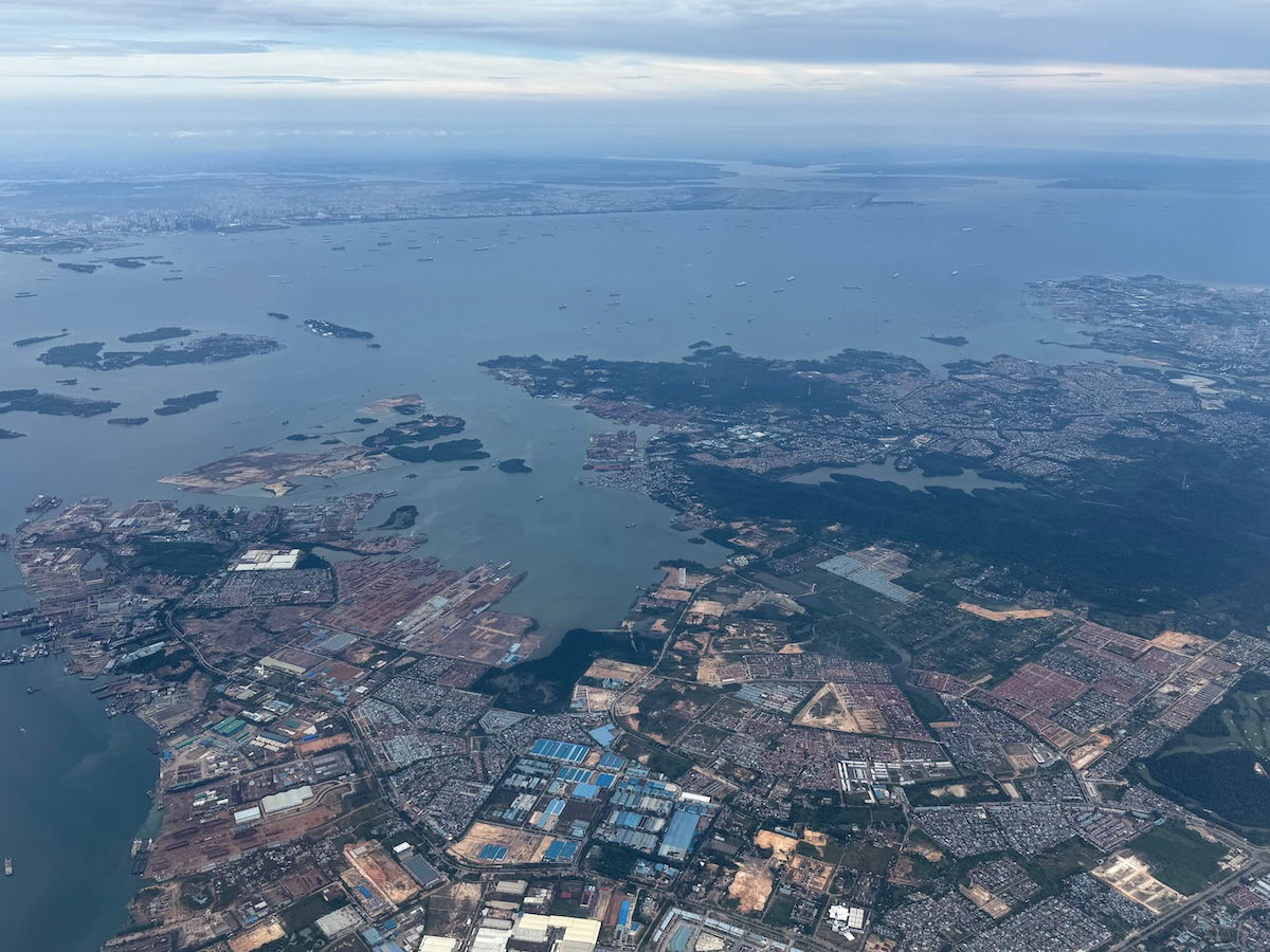 At that point I hadn’t even been served yet, but despite that, I never felt rushed. We did indeed start our descent at around 11:05AM, and then at 11:10AM the seatbelt sign was turned on. Our flight from Malaysia to Singapore took us down the coast along the Straight of Malacca, and then we flew out over the Singapore Strait and Batam, before turning back around and approaching Changi.