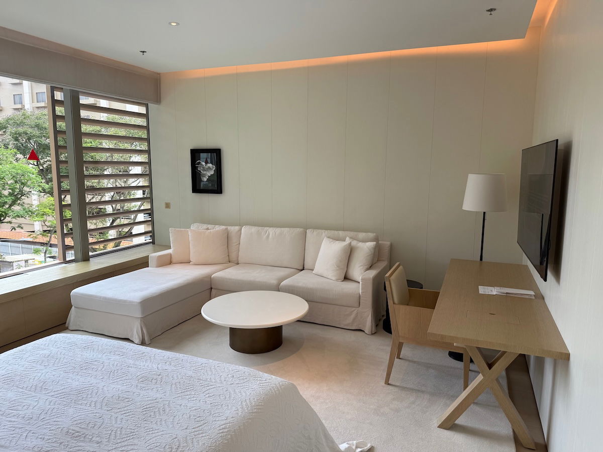 The room featured a comfortable king size bed, a large L-shaped couch, and a desk with a chair. I appreciate that there was a proper desk and sitting space, since so many rooms don’t have that anymore.