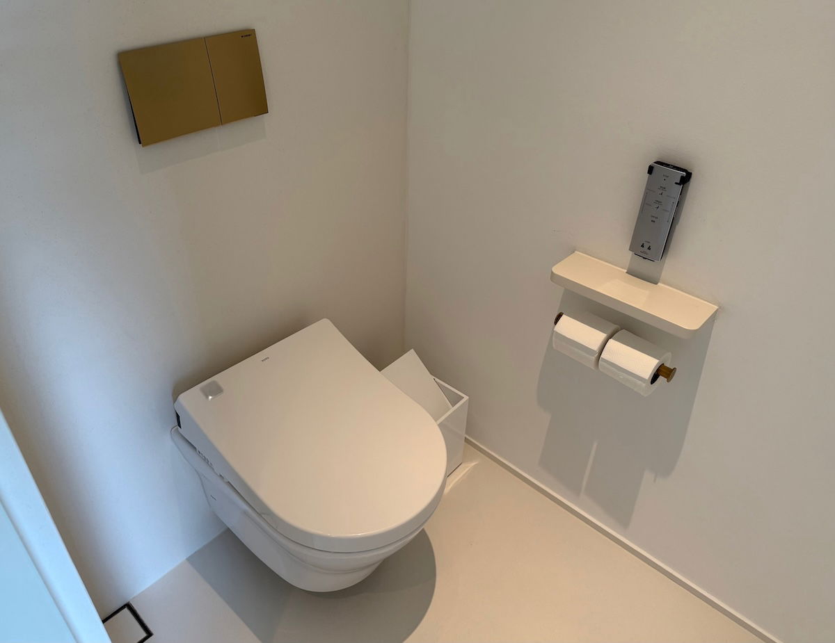 The bathroom was back toward the entrance, and was a good size. It boasted double sinks, a soaking tub, a walk-in shower, and a bidet-style toilet in a separate room, with toiletries from Le Labo.