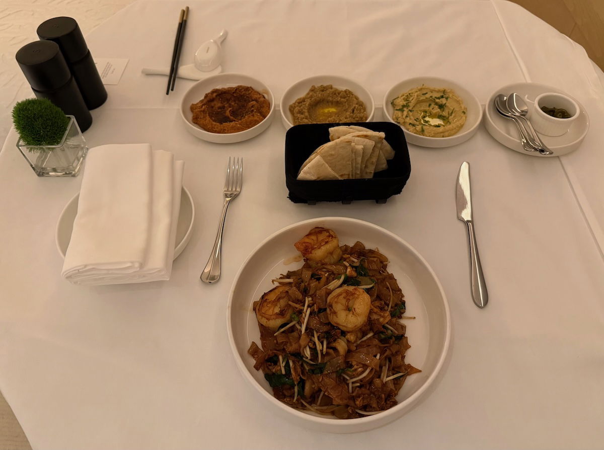 I ended up meeting a friend for dinner outside the hotel, so I can’t report back on any lunch or dinner experiences at the hotel restaurants. However, jetlag got the best of me, and I ended up being wide awake and hungry around 1AM, so I ordered a delicious prawn noodle dish and the mezze selection, which most definitely hit the spot.