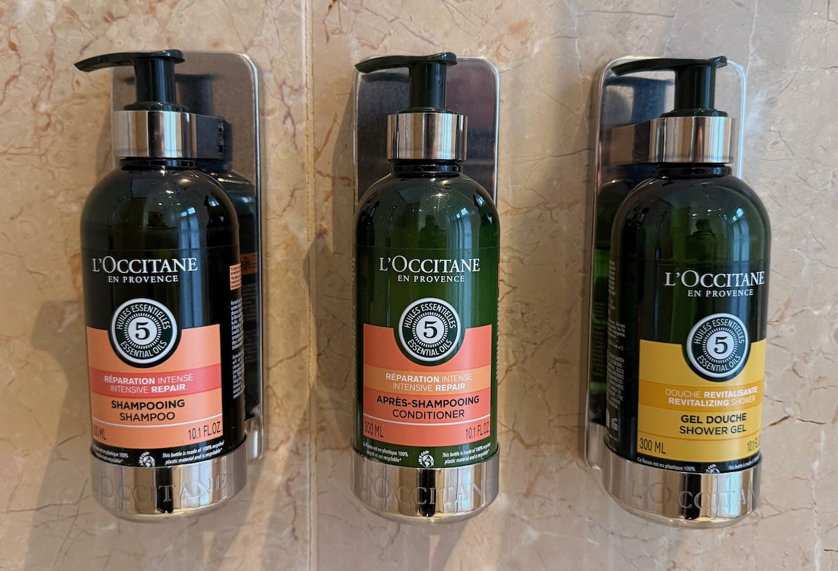Toiletries were in reusable containers, from L’Occitane.