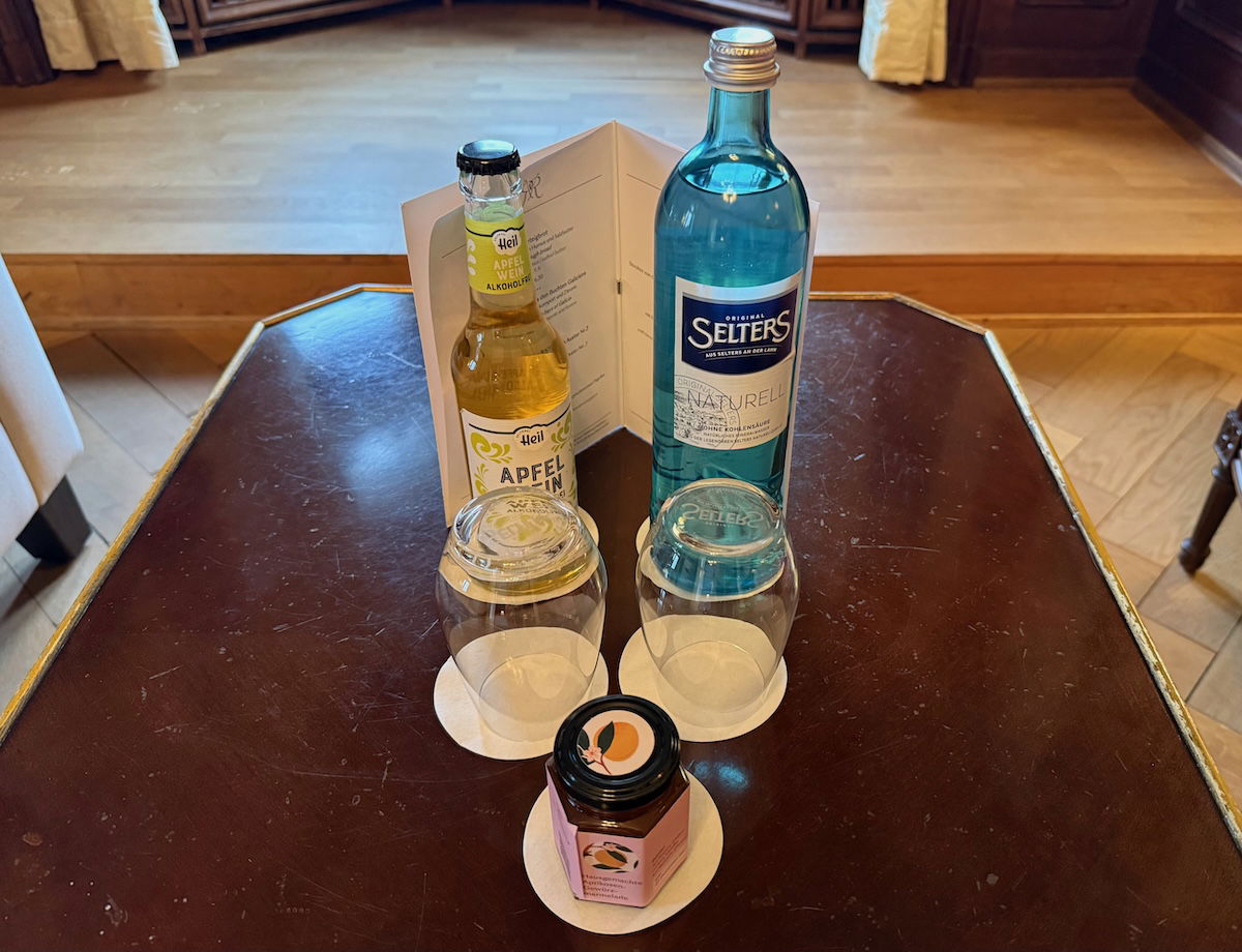Waiting on the table was a welcome amenity, consisting of a bottle of still water, a non-alcohol apple wine, and some jelly.