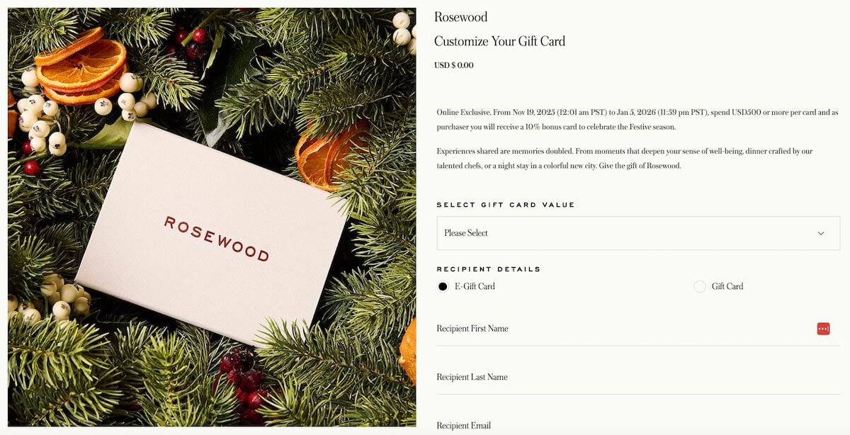 Through January 5, 2026, Rosewood Hotels & Resorts is selling gift cards with a 10% bonus. This promotion kicks in if you spend at least $500 on a gift card. Each e-gift can be for up to $2,000, and you can get up to $10,000 worth of gift cards per transaction. When you make the purchase, be sure that you see the 10% bonus reflected.