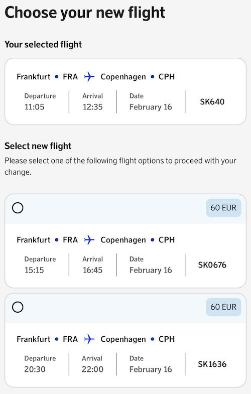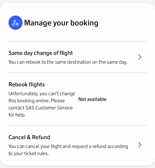 Annoying, despite SAS’ email indicating I could rebook through the website, that wasn’t initially the case, as obviously things weren’t programmed correctly. After pulling up my itinerary, I just saw the standard rebooking options, not reflecting that my flight was canceled: