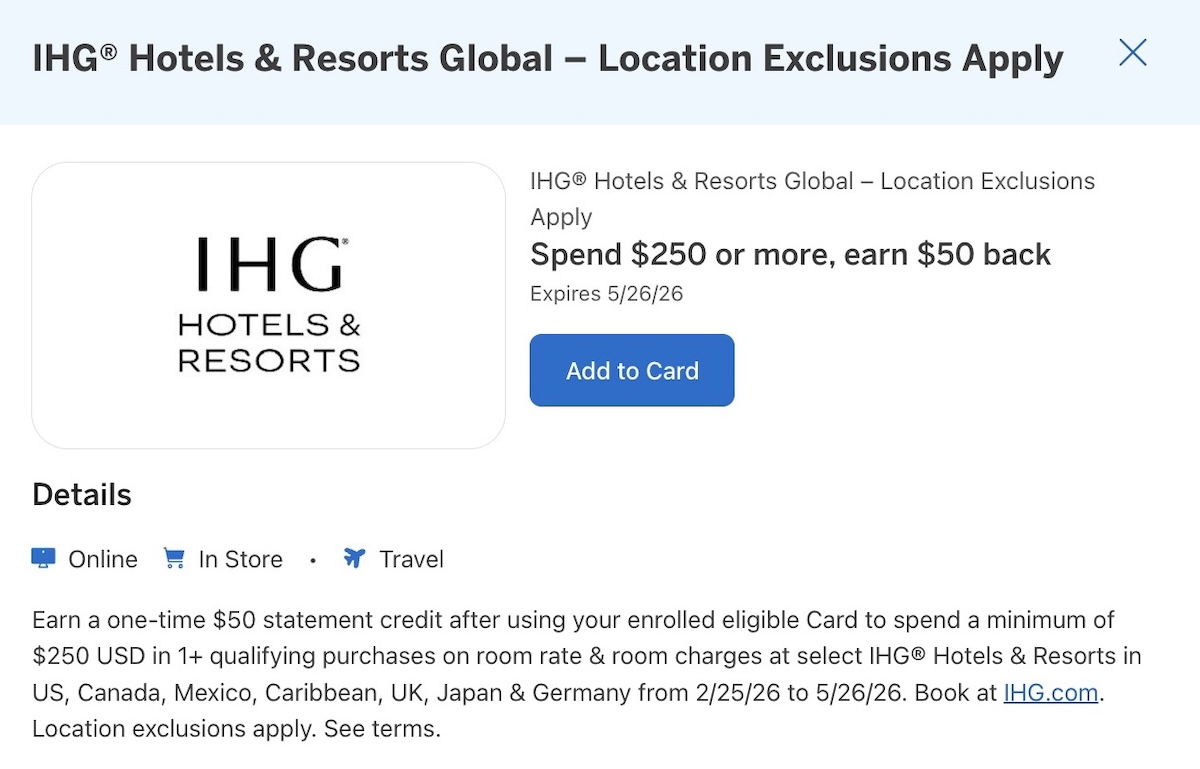 With a new targeted Amex Offers deal, you can save $50 when you spend $250+ at IHG properties in select regions, including the United States. This has the potential to be a very good deal, so if you have any upcoming IHG stays, be sure to register if eligible.